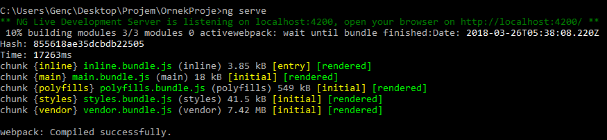 Eğer ki bu şekilde kodu çalıştırırsak uygulama varsayılan olarak “localhost” üzerinden “4200” portunda yayına geçecektir.