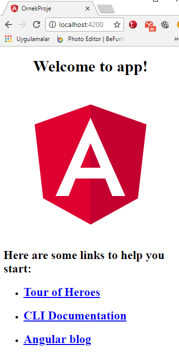 Bu şekilde kodu belirttiğiniz zaman proje “localhost”un “4200” varsayılan portu üzerinde yayınlanacaktır ve otomatik olarak bir tarayıcıda projeyi açacaktır.