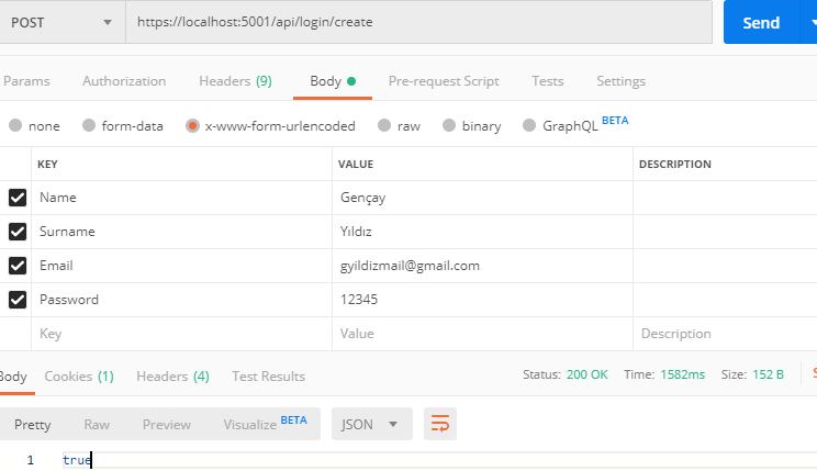 Unutmayın!!! Token bazlı kimlik doğrulama senaryosunda sistemin çalışması için “Startup.cs” dosyasındaki “Configure” metodu içerisinde ‘UseAuthorization’ middleware’ından önce ‘UseAuthentication’ middleware’inin çağrılması gerekmektedir. Aksi taktirde token ile yapılan istekler yine -401 Unauthorized- durum kodu olarak geri dönecektir.