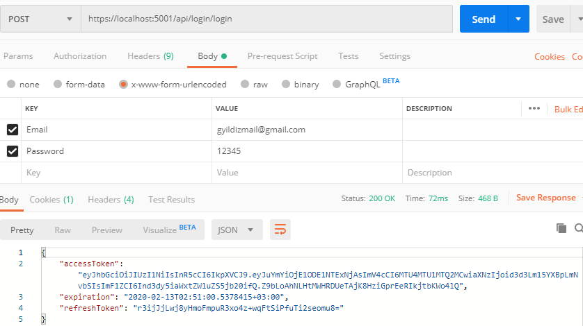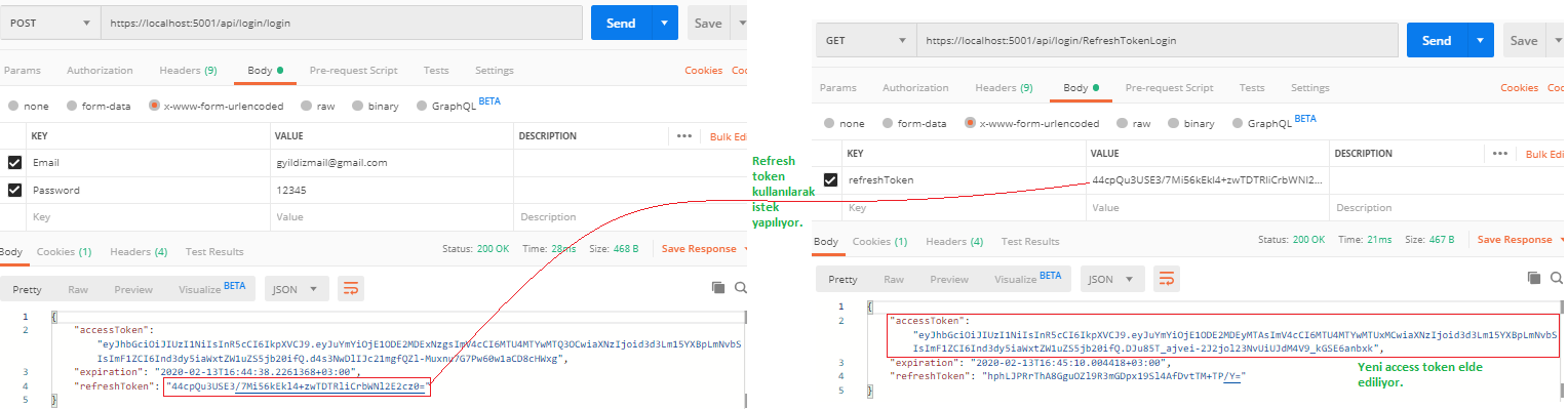 Görüldüğü üzere refresh token değeri ile yapılan istek neticesinde yeni bir access token değeri elde etmekte ve bu değeri aşağıdaki görselde olduğu gibi devam faaliyetlerimizde kullanabilmekteyiz.