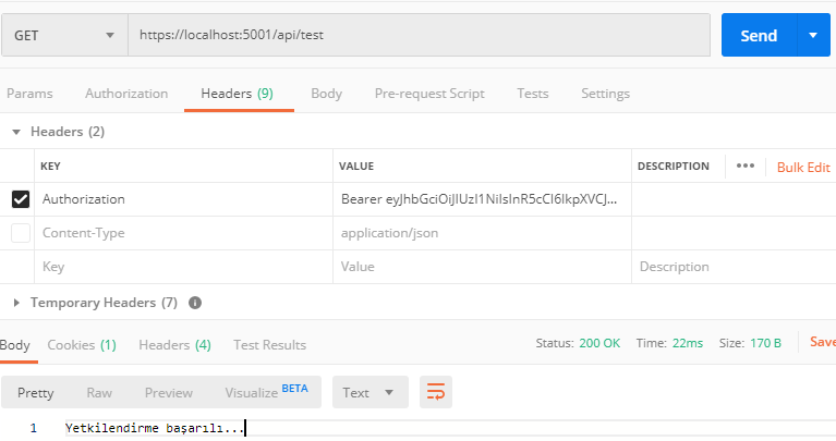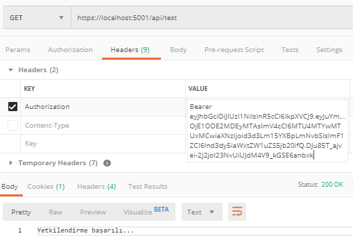 Yukarıdaki ekran görüntüsünü incelerseniz eğer “Headers” kategorisinde “Authorization” keyine karşılık verilen “Bearer {token}” değeri ile yapılan istek neticesinde token değerimizin başarılı bir şekilde doğrulandığını görmekteyiz.