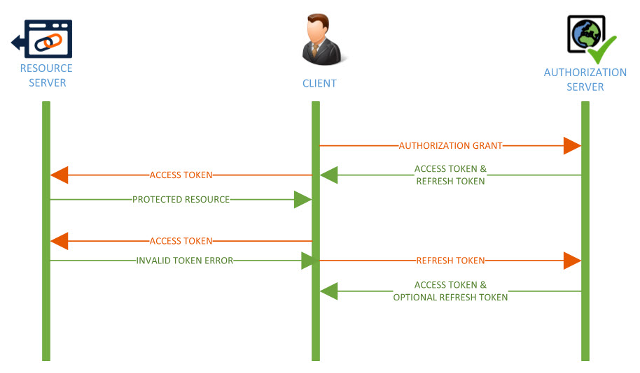 Yukarıdaki görüntüde olduğu gibi client öncelikle gerekli authorization için Authorization Server’a bir istekte bulunuyor ve bu istek neticesinde “Access Token” ile birlikte “Refresh Token” değerlerini elde ediyor. Süreçte Resource Server’a yapılan tüm istekler access token aracılığıyla gerçekleştiriliyor… Taa ki access token’ın süresi bitip geçersiz oluncaya kadar… İşte bu durumda kullanıcıyı tekrardan login sayfasına yönlendirerek kullanıcı adı ve şifre kontrolü yapmak yerine kullanıcıya önceden gönderilmiş olan refresh token değeri ile Authorization Server’a bir istekte daha bulunuluyor ve tekrar yeni bir access token üretilerek hiç vakit kaybetmeksizin kullanıcıya bu yeni token değeri ile kaldığı yerden devam etme olanağı tanınıyor. Tabi bu arada refresh token kullanıldıktan sonra geçerliliğini yitirerek üretilen access token değerine eşlik edebilecek yenisi üretilmiş oluyor.