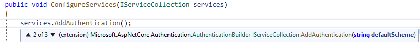 Asp.NET Core uygulamasında token ile authentication işlemlerini gerçekleştirebilmek için JWT Token servisini uygulamaya eklememiz gerekmektedir. Bunun için “Startup.cs” dosyasındaki “ConfigureServices” metodu içerisinde “AddAuthentication” middleware’i aracılığıyla bir şema oluşturarak işe başlamalıyız. İlgili metodu aşağıdaki görselde olduğu gibi çağırarak ikinci overloadına göz atarsak eğer;