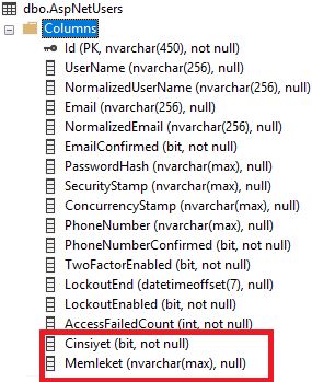 Eğer ki, uygulamamızda kullanıcılarımıza dair daha fazla bilgi tutacaksak ilgili model içerisine aşağıdaki gibi custom propertyleri yerleştirebiliriz.
