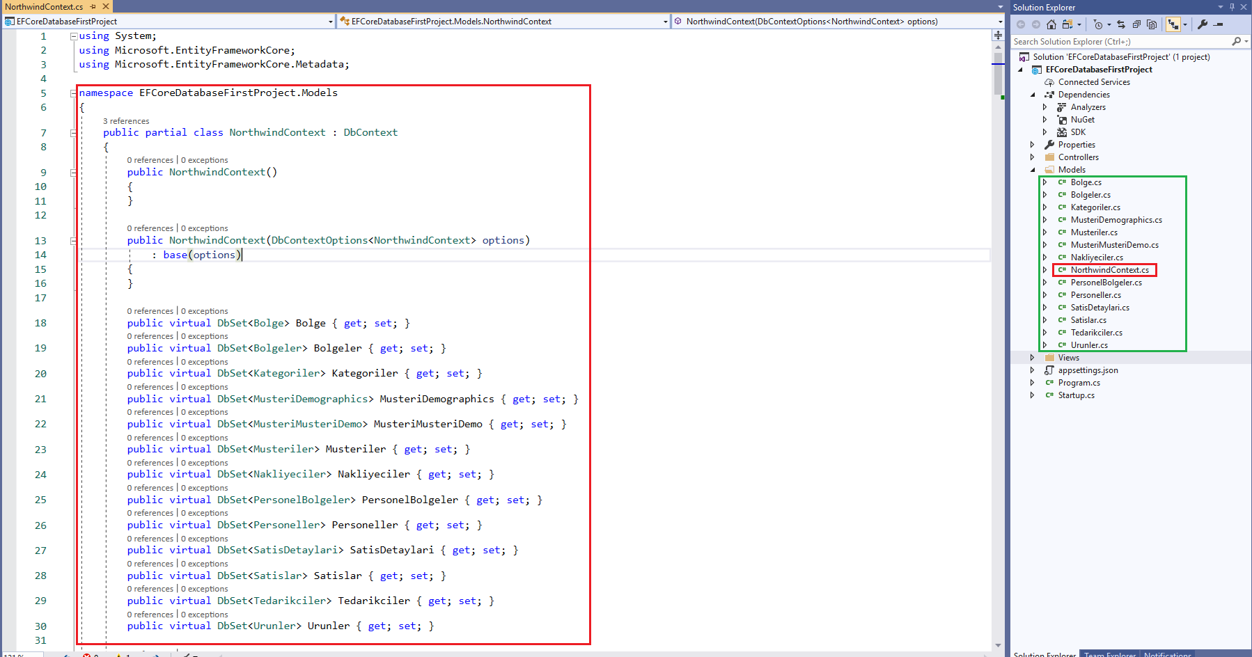 İlgili direktifi çalıştırdığımız zaman providerdaki veritabanı projeye taşınmakta ve aşağıdaki ekran görüntüsünde olduğu gibi oluşturulan context sınıfı direkt olarak açılmaktadır.
