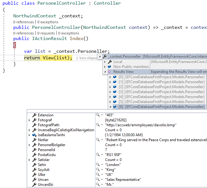 Ve evet… Yukarıdaki ekran görüntüsünde olduğu gibi Database First yaklaşımını kullanarak Asp.NET Core uygulamalarında mevcut veritabanımız üzerinde işlemlerimizi gerçekleştirmiş bulunmaktayız.