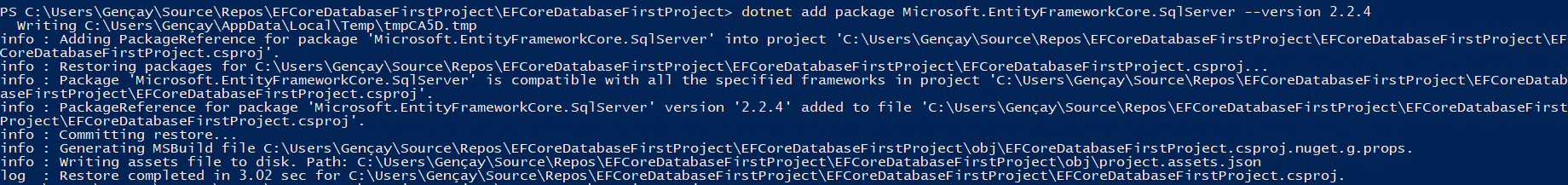 Entity Framework Core – Database First yaklaşımını kullanabilmemiz için Microsoft.EntityFrameworkCore.SqlServer kütüphanesini projemize yüklememiz gerekmektedir. Bunun için aşağıdaki kodu çalıştırarak .NET CLI yardımıyla ilgili kütüphaneyi projeye ekleyebiliriz. ilgili kütüphane makaleyi kaleme aldığım tarihte 2.2.4 versiyonundadır.
