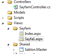 Öncelikle yeni bir Controller oluşturalım.Ben adına “Yeni(Controller)” ismini vermekteyim.Şuanda oluşturduğumuz bu Controller’ın View katmanında ne klasörünü oluşturduk, ne de Index adındaki Action’ı için klasördeki Index.aspx dosyasını.Bu dosyaları Visual Studio derleyicisine oluşturtturalım.