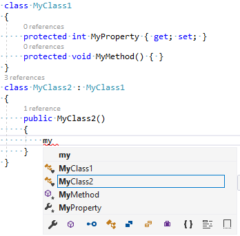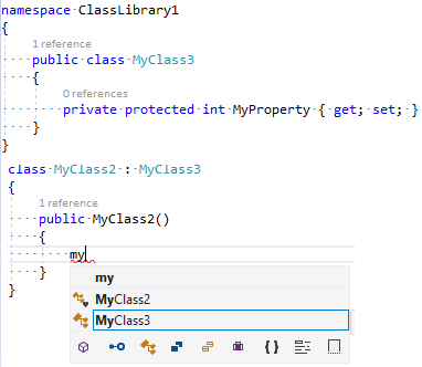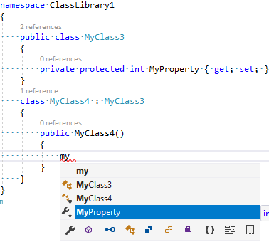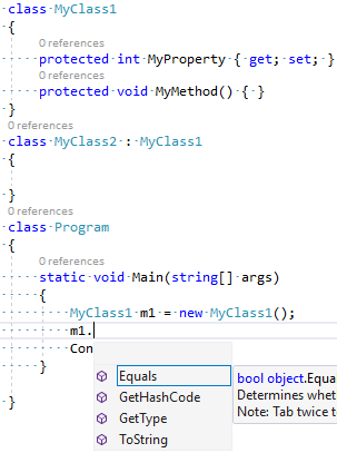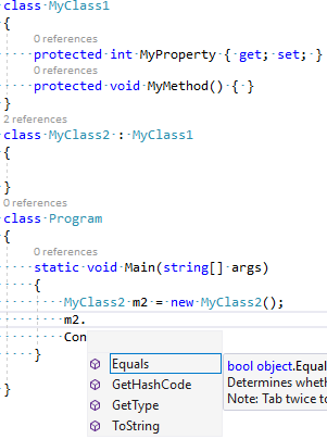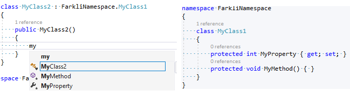 Görüldüğü üzere farklı bir namespace içerisinde bulunan “MyClass1” içerisindeki protected elemanlar kendisinden kalıtım alan “MyClass2” sınıfının içerisinde public özellik göstermektedirler.