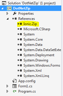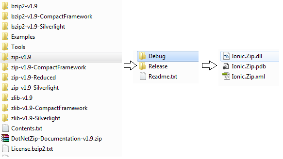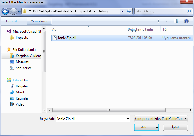 Yukarıdaki görüntüde gördüğünüz gibi indirdiğiniz dosyayı rardan çıkardıktan sonra, “zip-v1.9” -> “Debug” -> “Ionic.Zip.dll” kombinasyon dizisindeki .dll dosyası işimizi görecektir.
