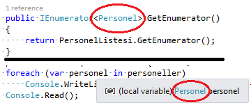 Örneğimizde bir “Personel” sınıfı oluşturup, “Personeller” sınıfı içerisinde ilgili sınıfın koleksiyon yapısını ve bu koleksiyona veri ekleme işlevini yapan Add metodunu tanımladım. GetEnumerator metodu içerisinde ise koleksiyonumuzun GetEnumerator() metodu sayesinde bir enumerator elde edip return ettim.