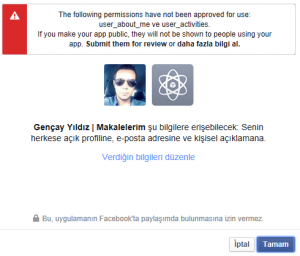 OAuth 2.0’ın bir başka getirisi ise client ile resource(kaynak API) arasındaki yetkilendirme konfigürasyonunu sağlamasıdır. Yani client, ‘OAuth Service’ uygulamasından API’a dair hangi bilgileri ve yetkileri istediğini bildirebilir. Burada onaylayıcı merci kullanıcı olacaktır. Günlük hayattaki internet kullanımınızda herhangi bir web uygulamasında ‘Facebook Üzerinden Giriş Yap’ yöntemiyle elbette ki oturum açmışsınızdır. Oturum açarken Facebook’un sizi şöyle bir pencere ile uyardığını hatırlayınız…