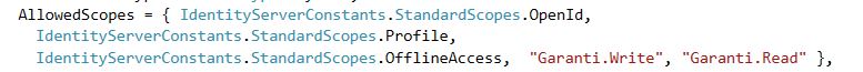 Yukarıdaki ekran görüntüsünü incelerseniz eğer client’ın hem ‘Config.cs’ dosyasında belirtilen ‘AllowedScopes’ değerlerini