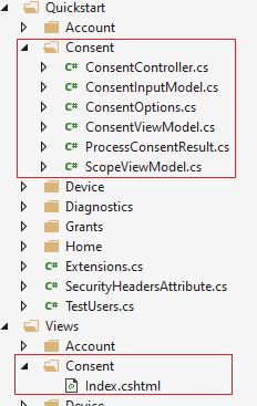 Hatırlarsanız eğer yazı serimizin 11. makalesinde(bknz : Merkezi Üyelik Sistemi Temelleri) Auth Server’da ki UI kısmını hızlıca ayağa kaldırmamızı sağlayan IdentityServer4.Quickstart.UI paketini kullanmıştık. İlgili paketin getirdiği yapılanmalara göz atarsak eğer aşağıdaki görselde olduğu gibi onay sayfası ve işlemleriyle ilgili tüm yapılanmaları barındırmakta ve bizlere sunmaktadır.