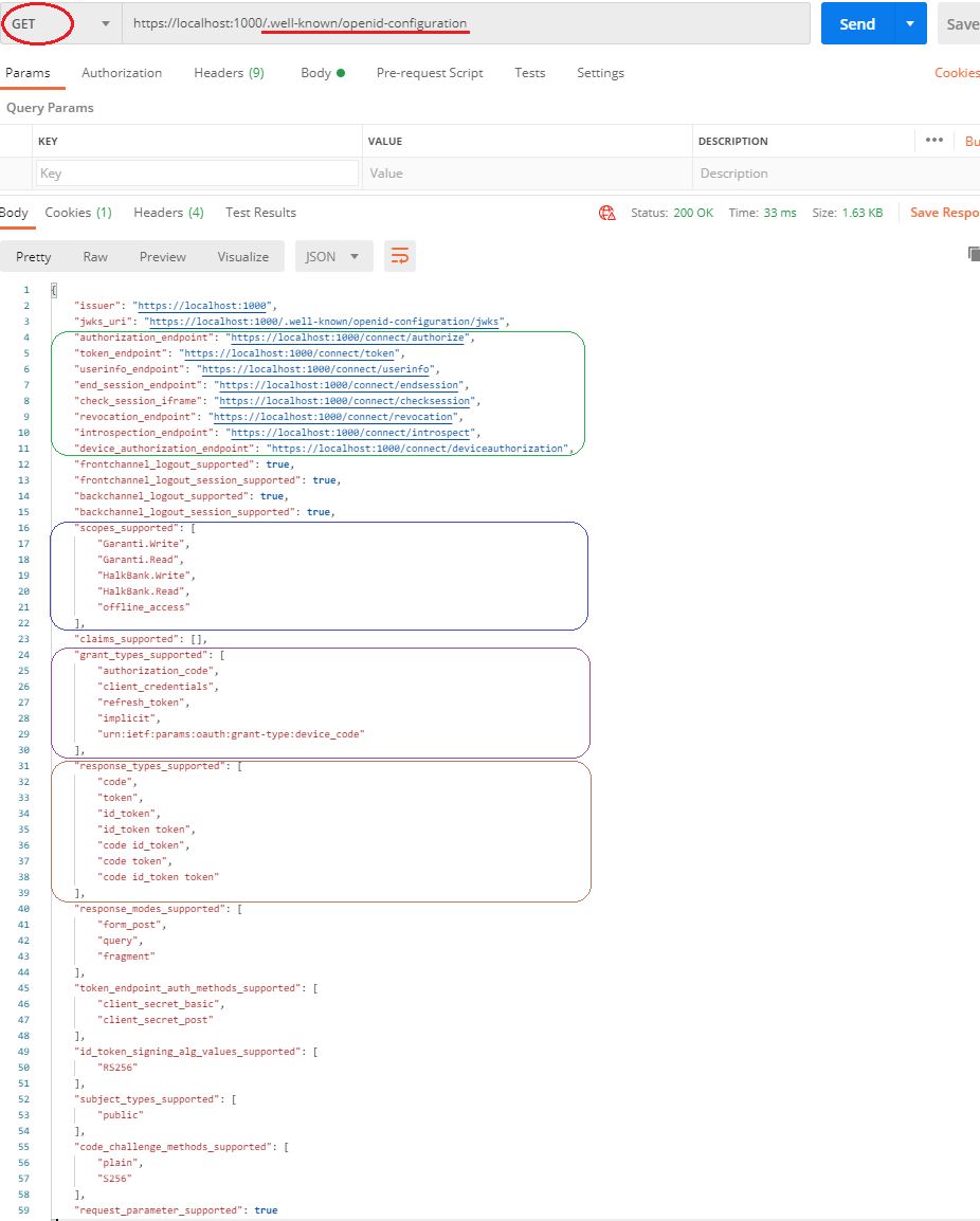 İlgili endpoint’e ‘GET’ isteği yapıldığı taktirde yukarıdaki ekran görüntüsünde olduğu gibi hedef IdentityServer4 uygulamasının tüm bilgileri tarafımıza gelmektedir. Bu bilgiler üzerinden; ilerideki makalelerde tek tek ele alacağımız diğer hazır endpoint’lere(yeşil), Auth Server’ın desteklediği yetkilere(scopes_supported)(mavi), hangi yetki/erişim tiplerini desteklediğine(grant_types_supported)(mor) yahut desteklenen dönüş türlerine(response_types_supperted)(kahverengi) gibi birçok özelliğe erişebilmekteyiz.