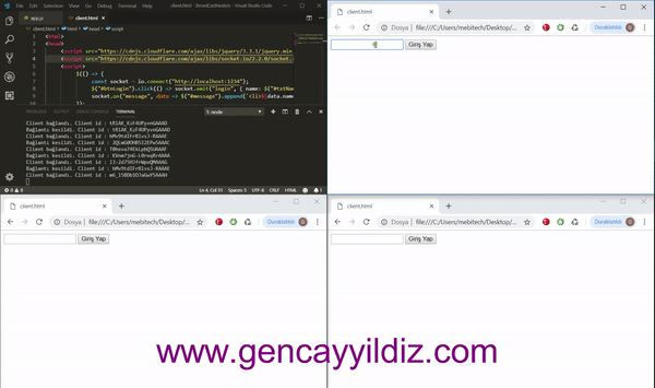 Burada ise client sockete bağlanmakta ve jQuery eşliğinde button nesnesine tıklandığı vakit “login” isimli olay yaratılmaktadır. Akabinde clienttaki “login” olayı tetiklendiği vakit sockette yaratılan “message” olayı burada dinlenilmektedir.
