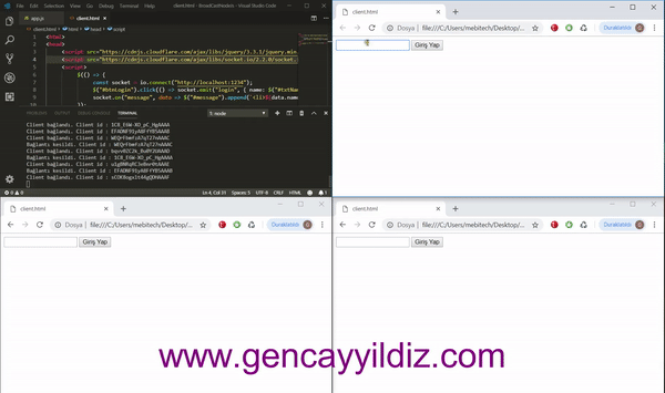 Evet, gördüğünüz üzere “login” neticesinde client tarafından gelen datayı tüm clientlara gönderebilmek için bir başka deyişle çoklu erişim sağlayabilmek için “client.broadcast.emit(“message”, data))” komutu uygulanmıştır. Yani clienta özel event emit edilmeden önce “broadcast” komutu çağrılarak o anda veri gönderen client haricindeki tüm clientlara bu işlemin(emit) yapılacağı bildirilmektedir. Dolayısıyla “message” eventını dinleyen tüm clientlarda aşağıdaki ekran görüntüsünde olduğu gibi gerekli bilgilendirme sağlanmış olunuyor.
