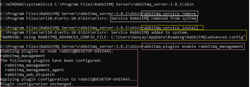 1. Bir komut istemcisini yönetici olarak çalıştırın ve C:\Program Files\RabbitMQ Server\rabbitmq_server-3.8.2\sbin> dizinini açınız.