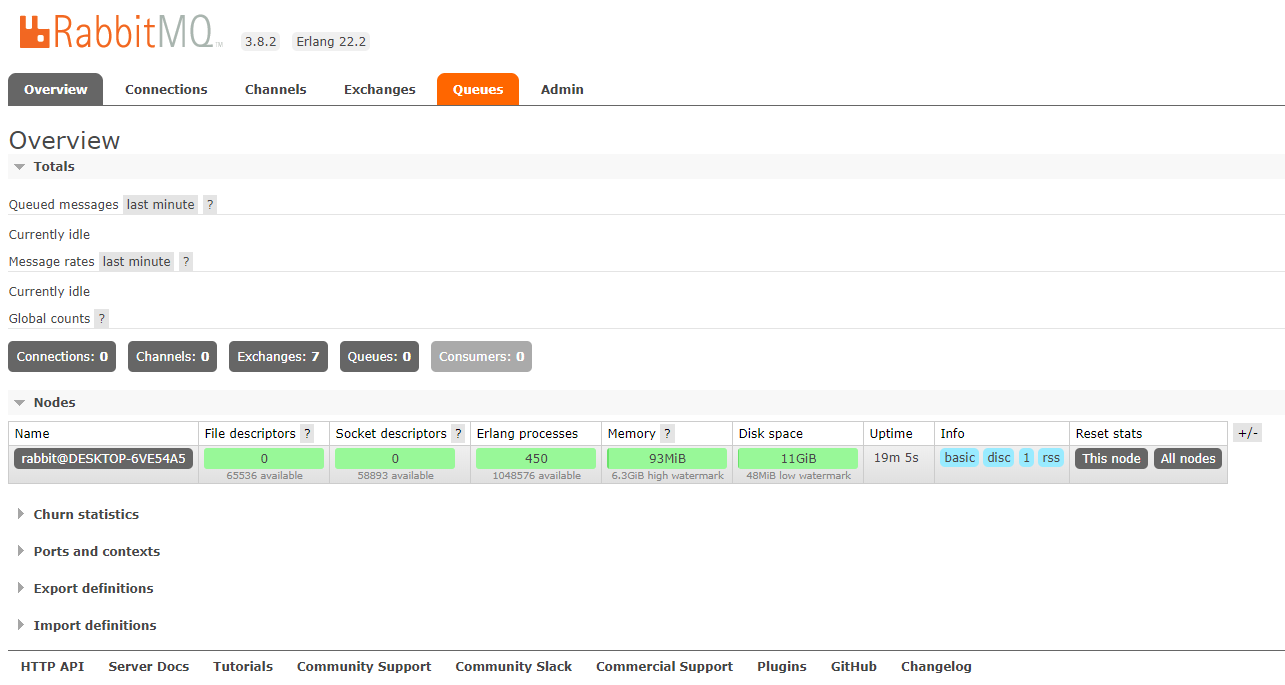 Giriş yaptıktan sonra karşımıza RabbitMQ sunucusunun overview sayfası gelmektedir. Yukarıdaki ekran görüntüsü aracılığıyla arayüze genel olarak baktığımızda “Connections” sekmesinde RabbitMQ sunucusuna yapılan bağlantıları, “Channels” sekmesinde kanalları, “Exchanges” sekmesinde sonraki makalelerimizde a’dan z’ye detaylandıracağımız exchangeleri, “Queues” sekmesinde tüm kuyrukları ve “Admin” sekmesinde ise sisteme giriş yapan tüm yöneticileri görebilmekteyiz.