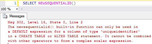 NewID() fonksiyonu bildiğimiz gibi her yerde(select, insert vs.) kullanılabilirken, NewsequentialID fonksiyonu bir tek kolonlarda Default Constraint olarak kullanılabilmektedir. Bu durumda aşağıdaki gibi bir problemle karşılaşmaktayız.