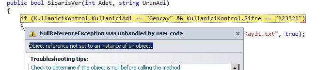Eğer bu şekilde kodları çalıştırırsanız, “NullReferanceException” adındaki hatayla karşılaşacaksınız.Bu hata bize