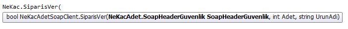 Görüntüde gördüğünüz gibi, [SoapHeader(“KullaniciKontrol”)] attribute’u sayesinde SoapHeaderGuvenlik tipinden KullaniciKontrol referansına nesneyi bağlamıştık.Söz konusu attribute “SiparisVer” metodunun attribute’u olduğu içinde, metodu kullanırken ilk parametre olarak SoapHeaderGuvenlik tipinden otomatik olarak bizden nesne istemektedir.