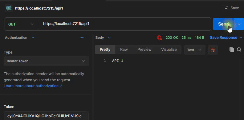 Bir API Gateway’den bekleneceği üzere YARP ile de istekleri hedef servislere yönlendirirken öncelikle kimlik doğrulama ve yetki kontrolü zorunlu kılınabilmektedir. Bunu örneklendirebilmek için aşağıdaki gibi güvenlik protokolü uygulamış olan ‘API1’ servisine API Gateway üzerinden erişim gösterilmeye çalışıldığını varsayalım;